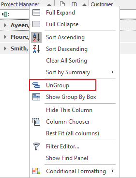 - To return the data to its original form, right-click on the Project Manager column and select Cancel Grouping .
