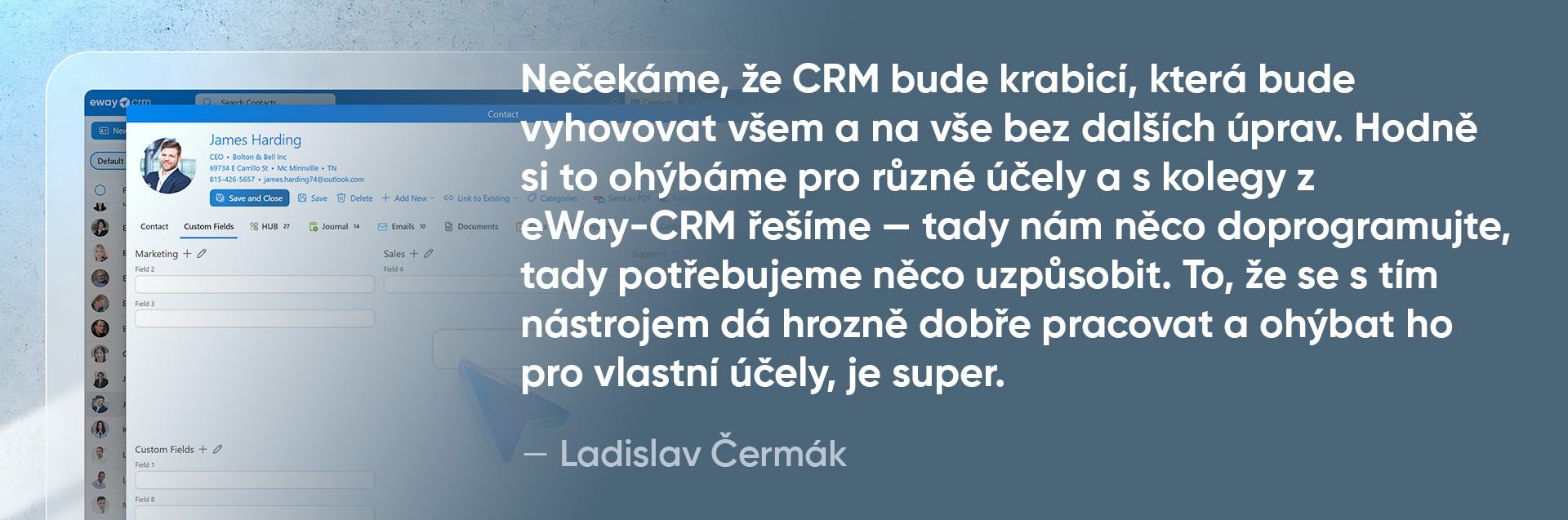 - Přizpůsobení systému je nutnost, ne luxus — firma aktivně spolupracuje s vývojáři eWay-CRM na doprogramování specifik.