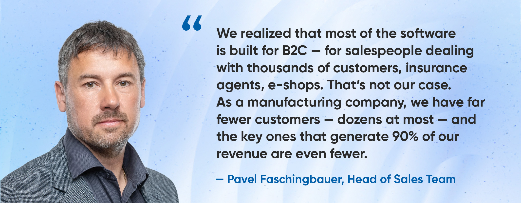 - Manufacturing B2B companies have different needs than e-shops or insurance firms — a smaller number of key customers demands a CRM built for depth, not breadth.